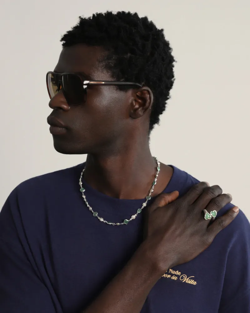 Limited edition ring featuring organic heart-shaped designs and natural stones. Sterling silver with green jade. Waterproof for everyday wear.