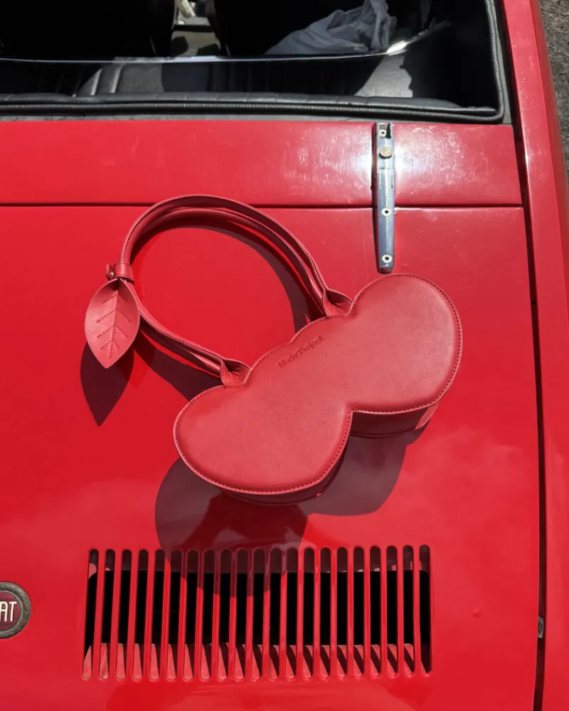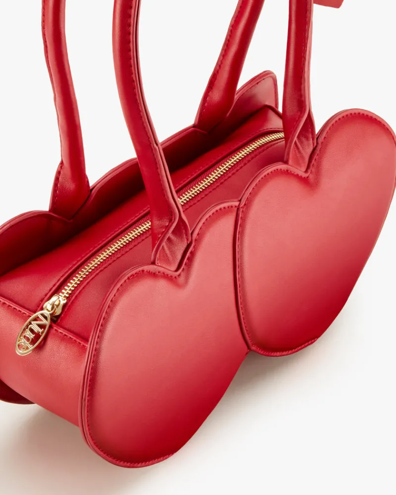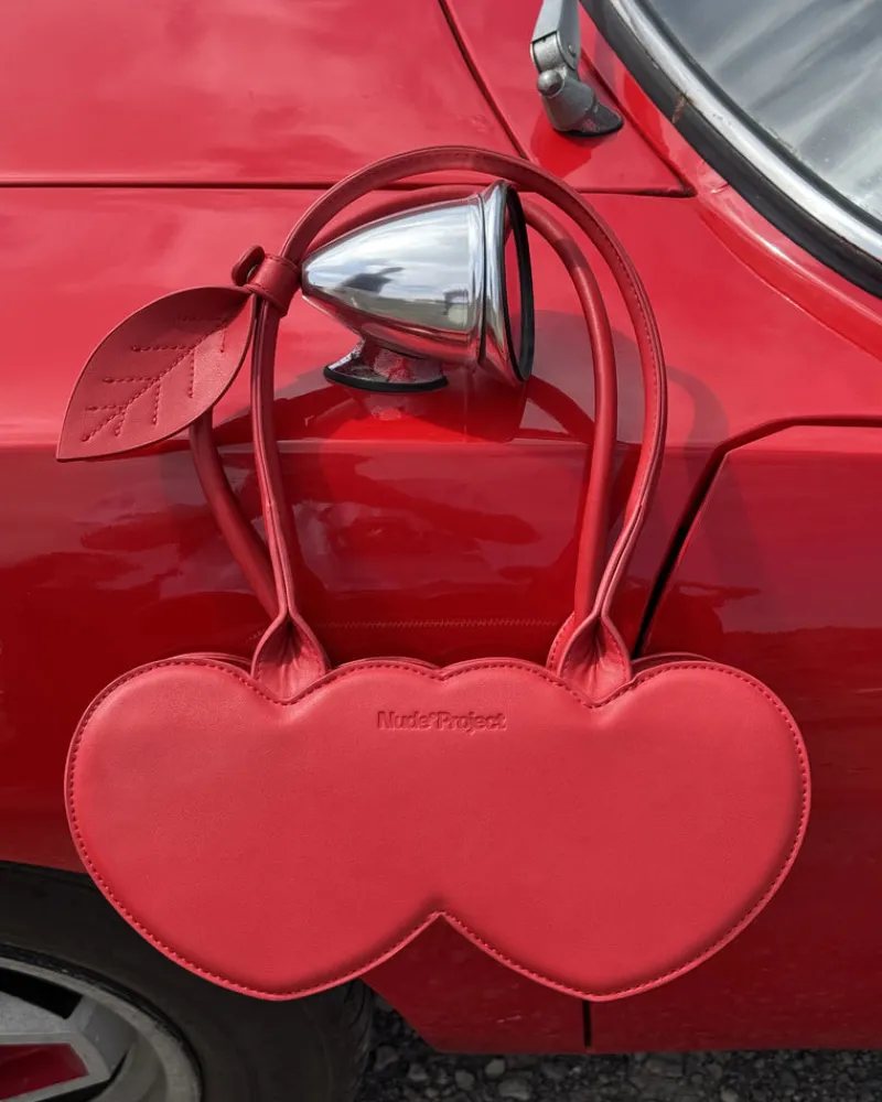 Iconic cherry-shaped design with a leaf detail on the handle for a playful and unique touch. Zipper closure with an interior pocket for added functionality.