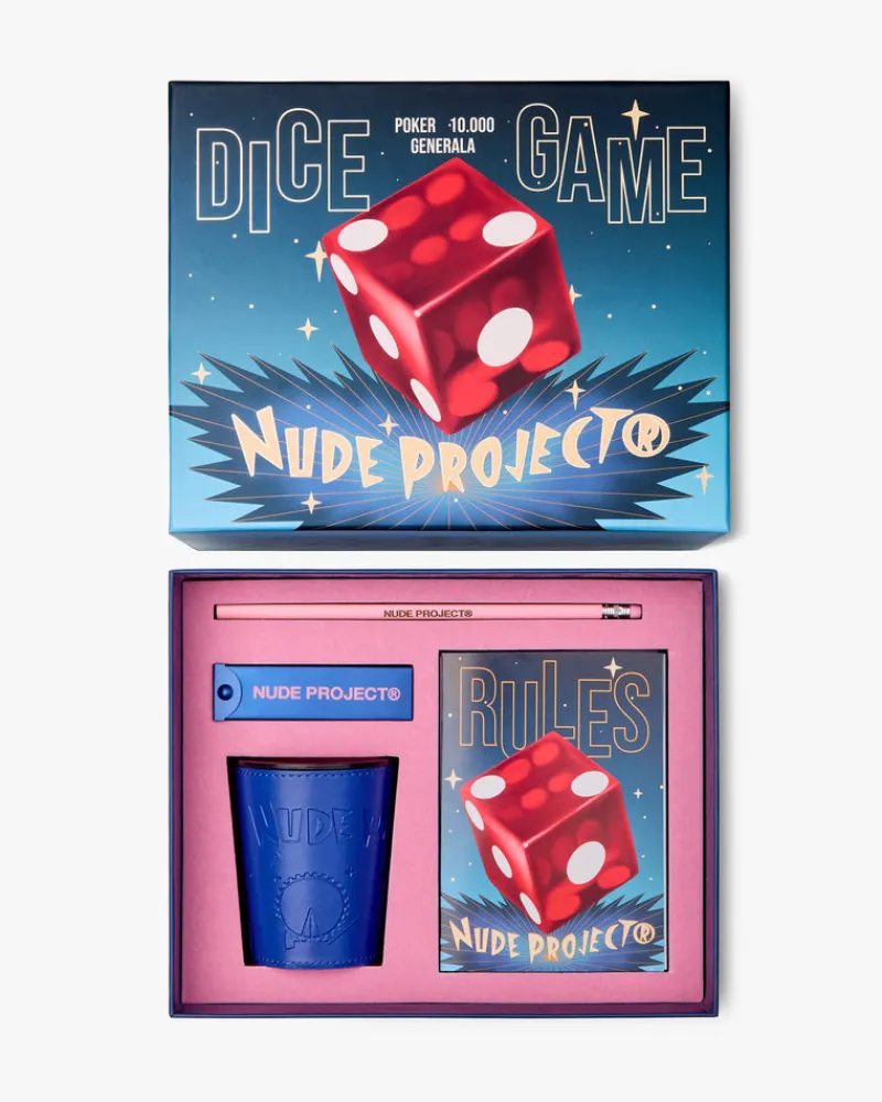 Includes a set with dice, cup, pencil, notebook, and pink foam. Exclusive graphics.