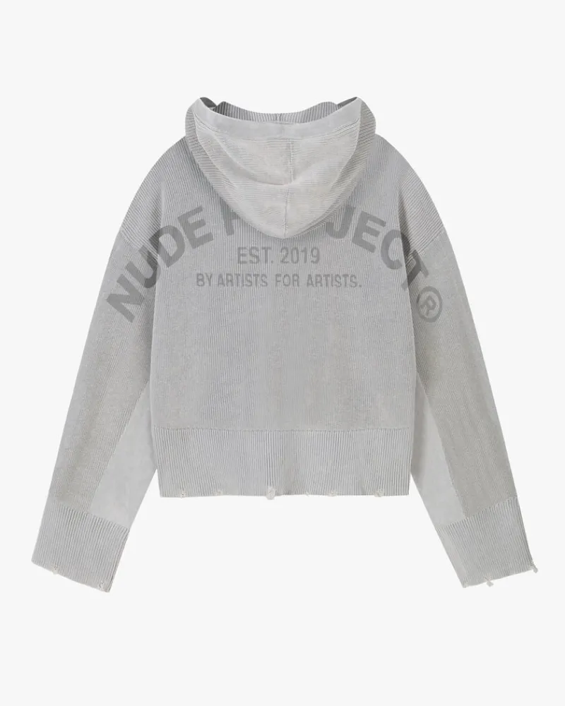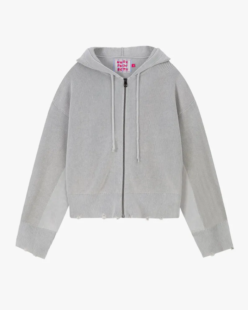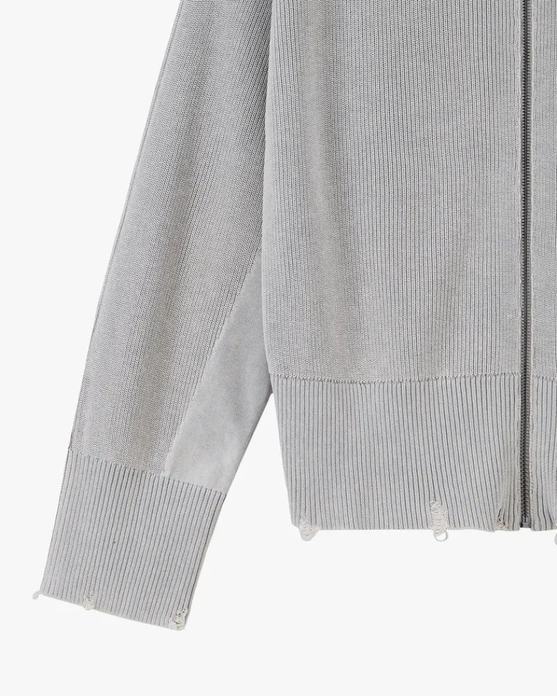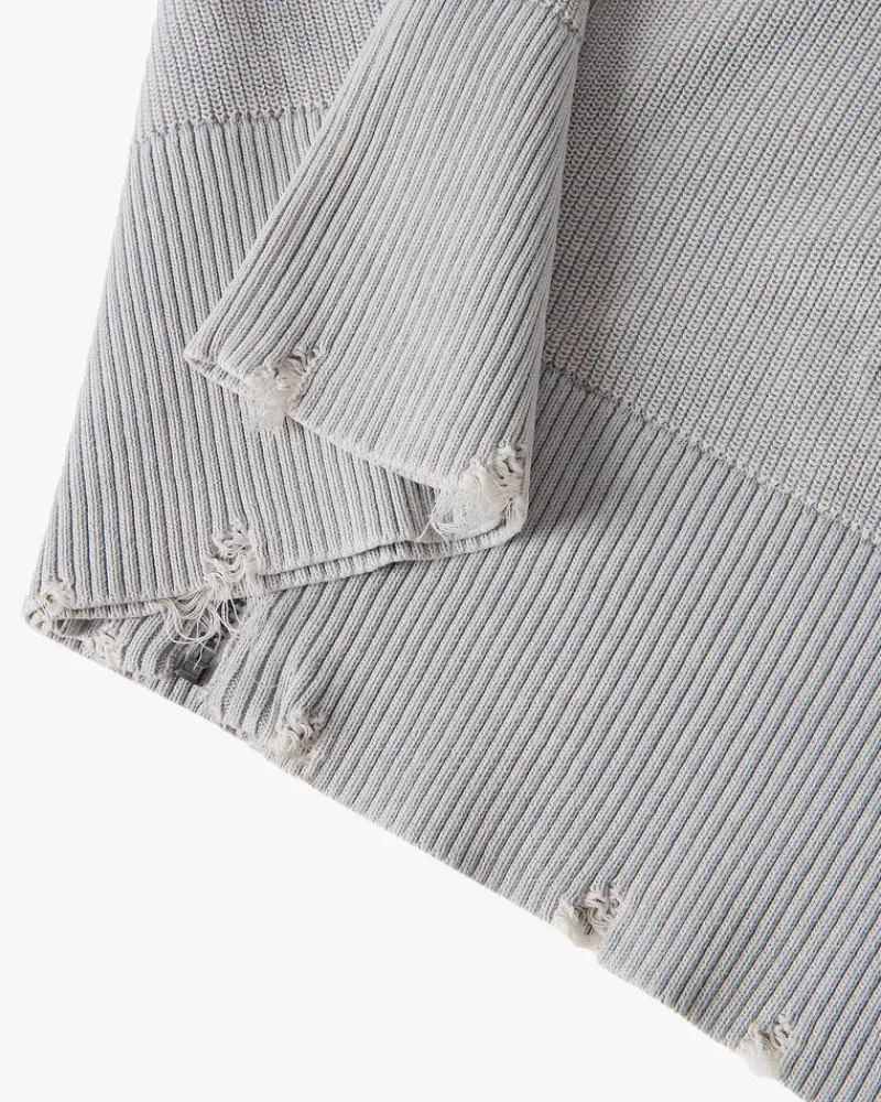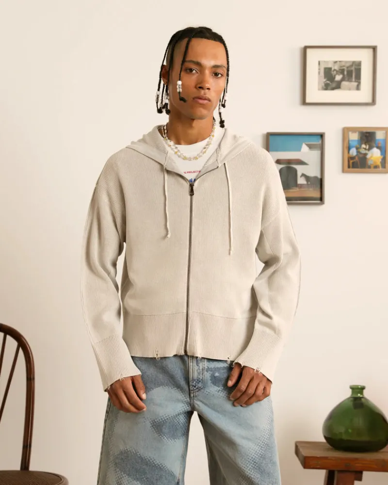 Knitted Hoodie With Garment Dye. Distressed Effect And Wide Ribbed Hem And Cuffs