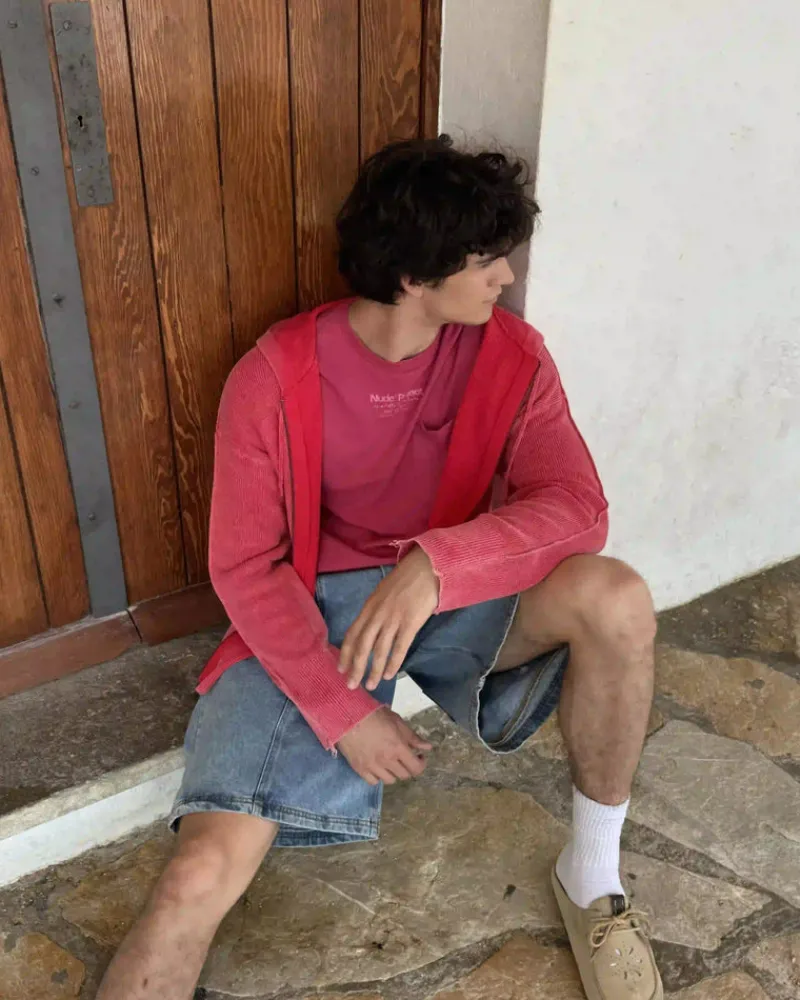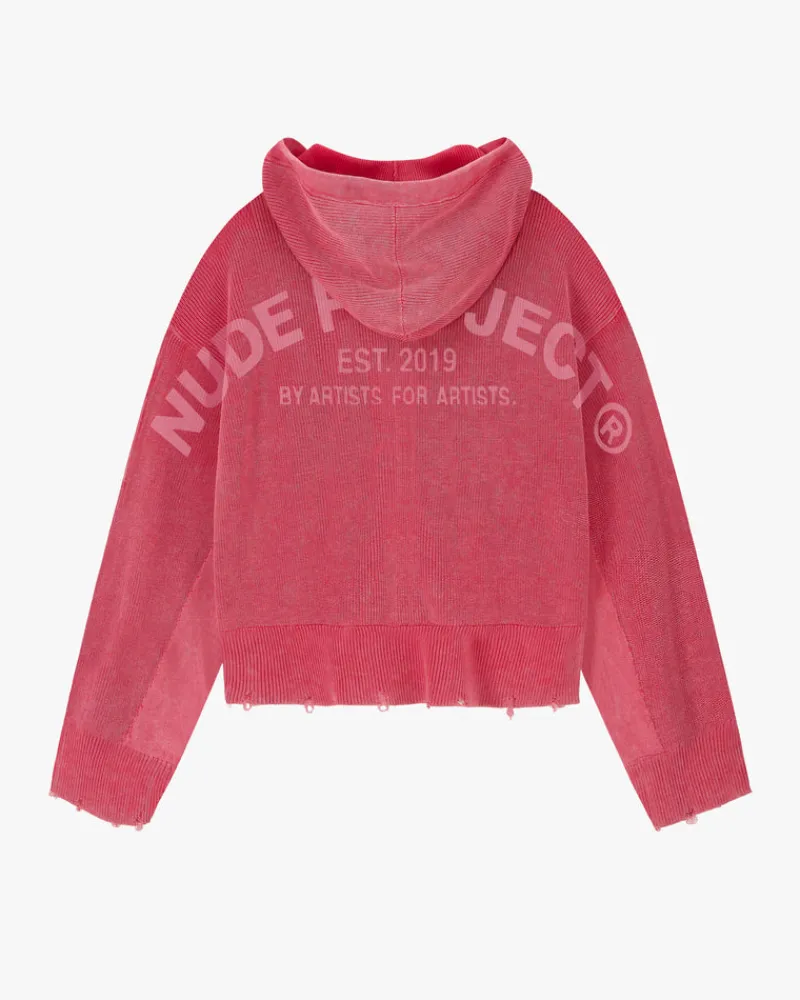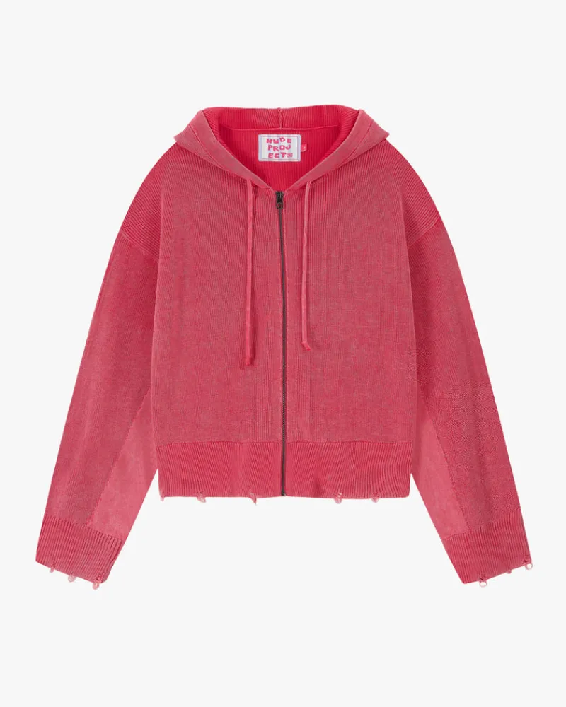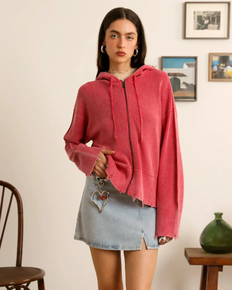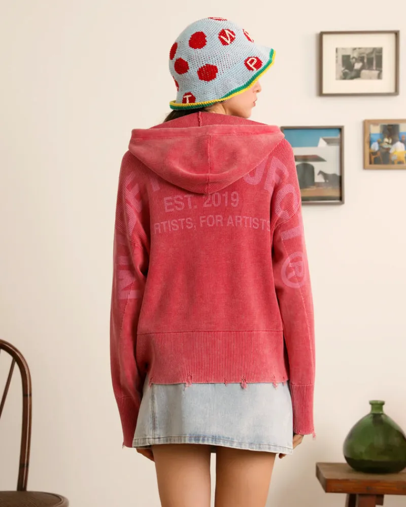 Knitted Hoodie With Garment Dye. Distressed Effect And Wide Ribbed Hem And Cuffs