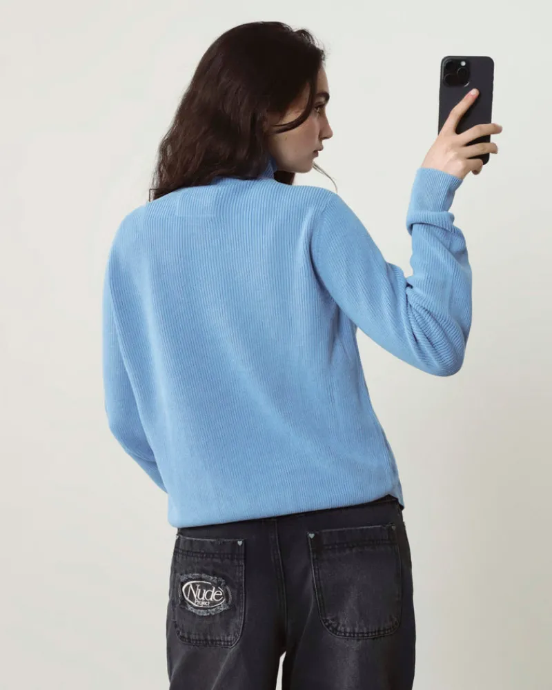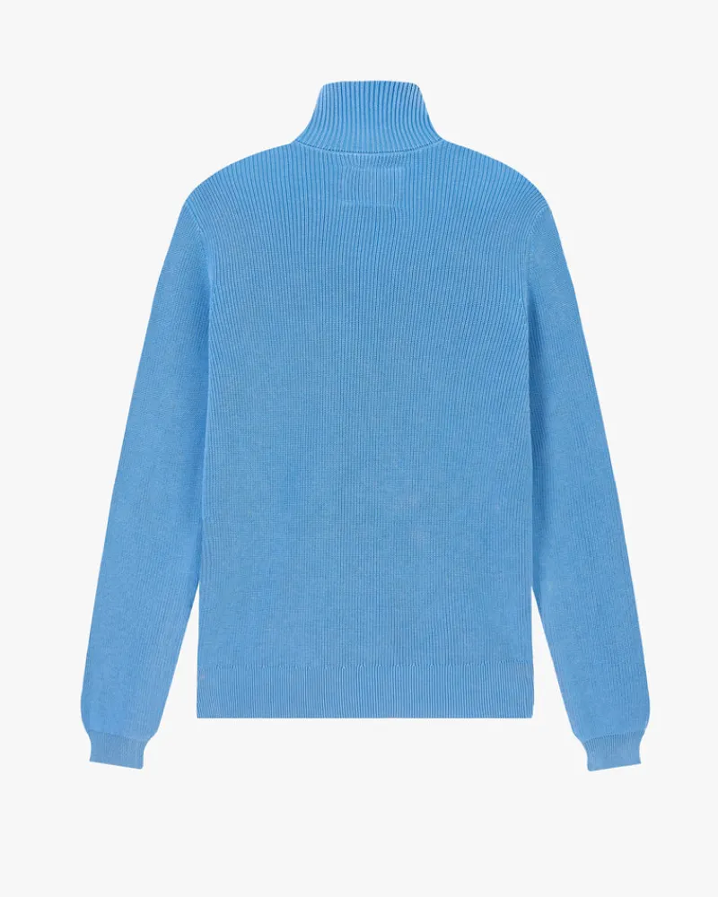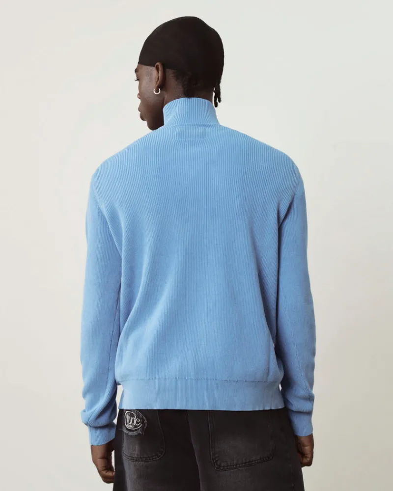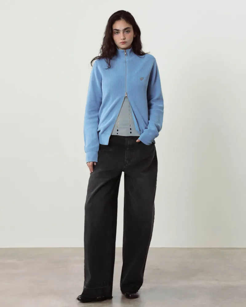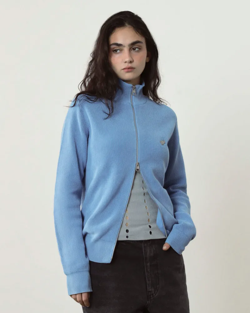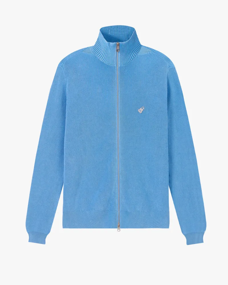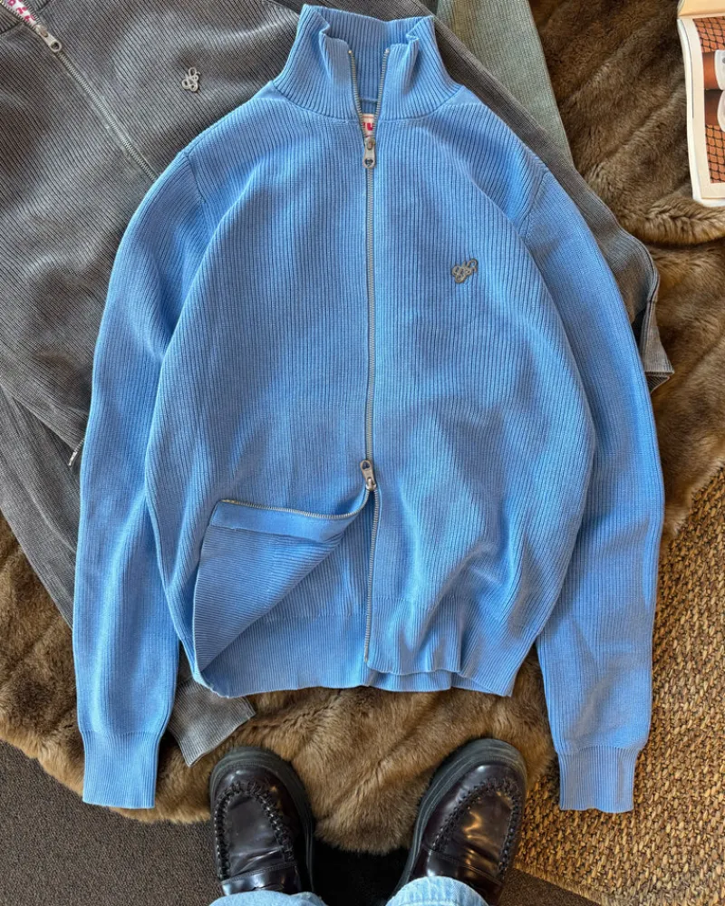 Knitted zipper with custom double puller. Yarn dye and hard wash.