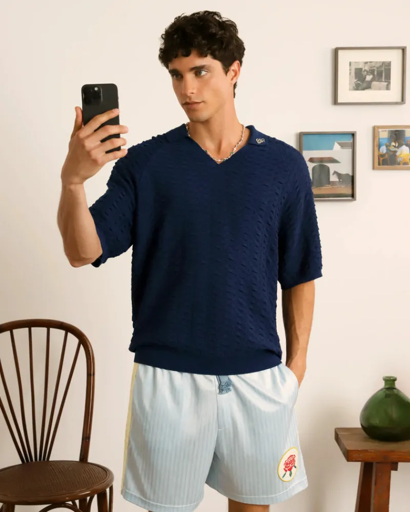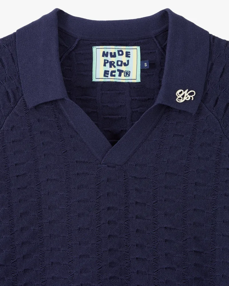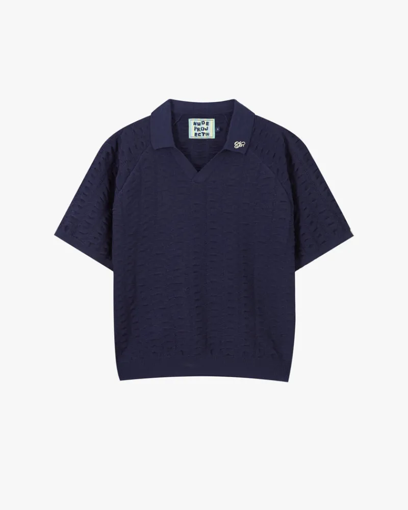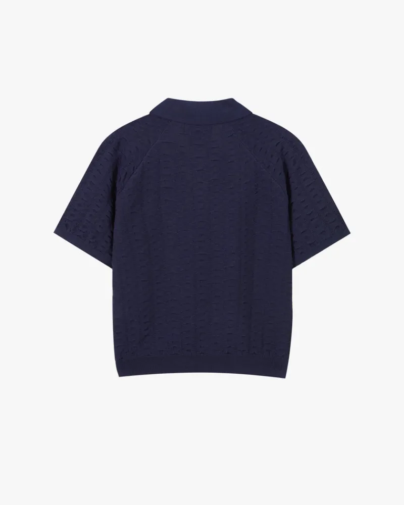Knitted short-sleeved polo with ribbed open collar with no buttons