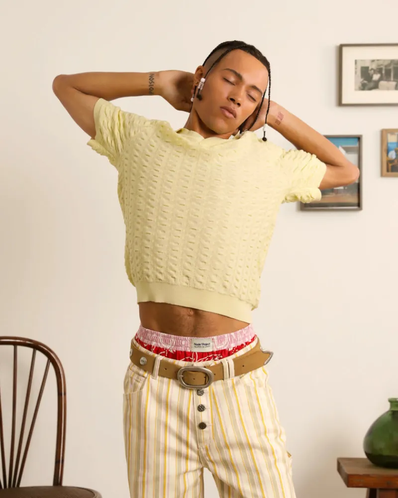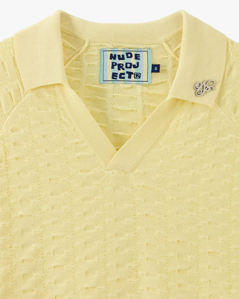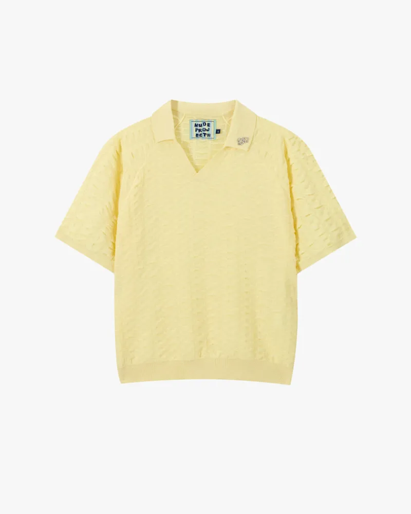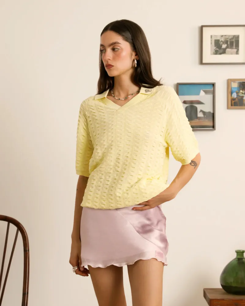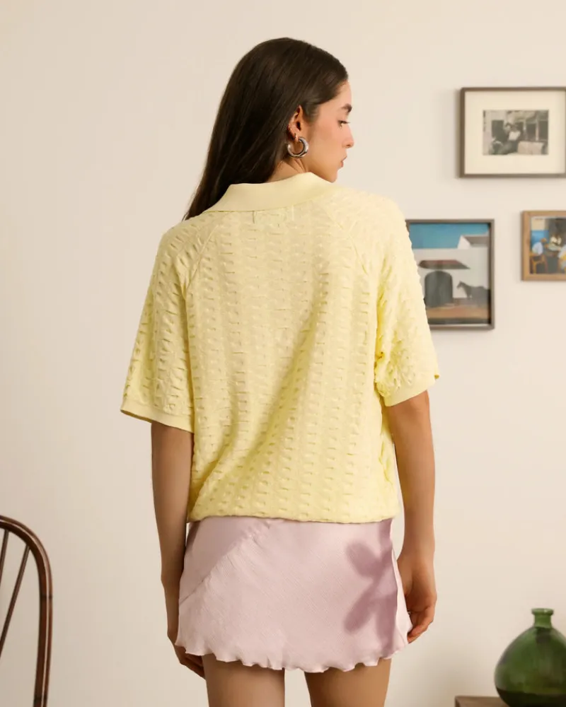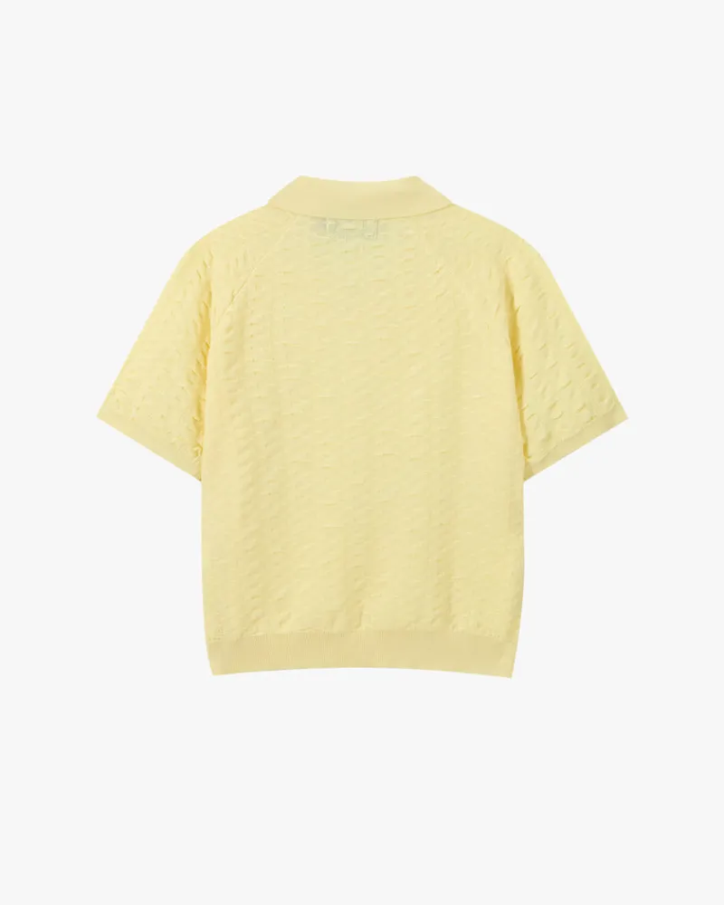 Knitted short-sleeved polo with ribbed open collar with no buttons