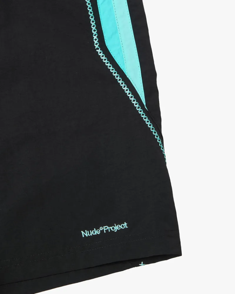 High density nylon swimsuit with two-tone band, decorative cross stitch and back pocket.