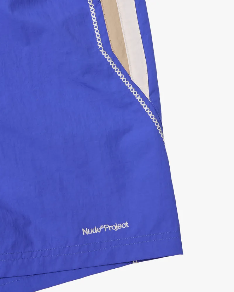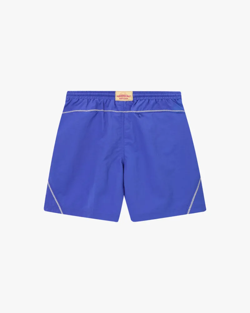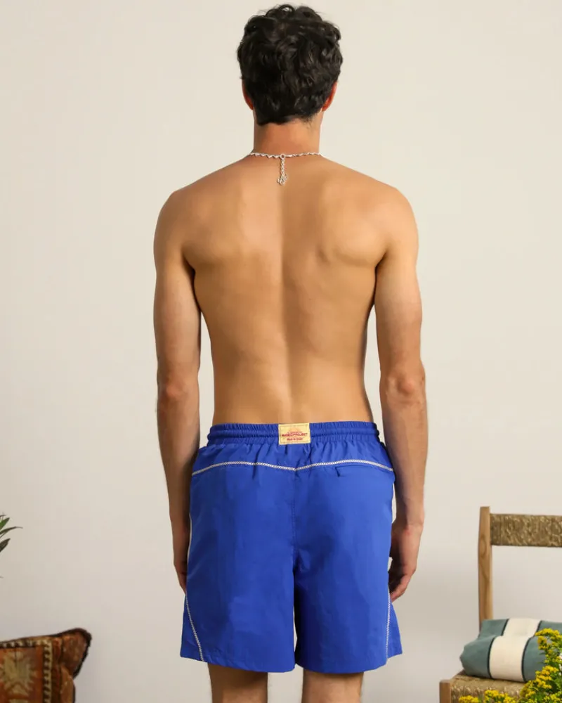 High density nylon swimsuit with two-tone band, decorative cross stitch and back pocket.