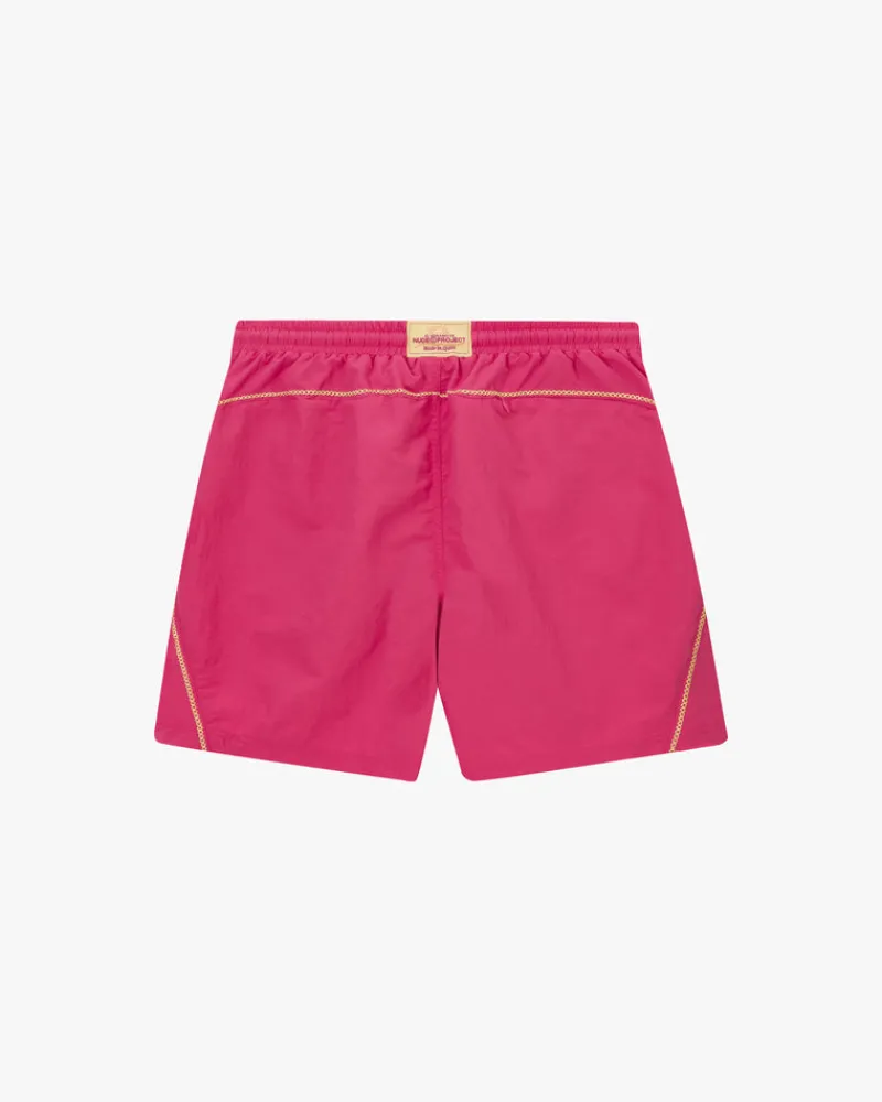 High density nylon swimsuit with two-tone band, decorative cross stitch and back pocket.