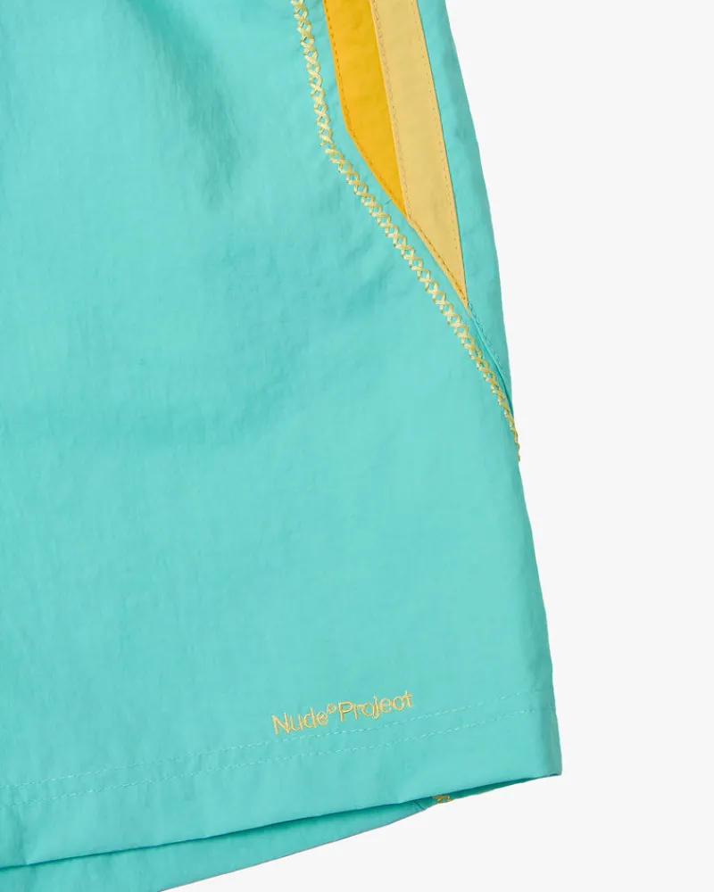 High density nylon swimsuit with two-tone band, decorative cross stitch and back pocket.