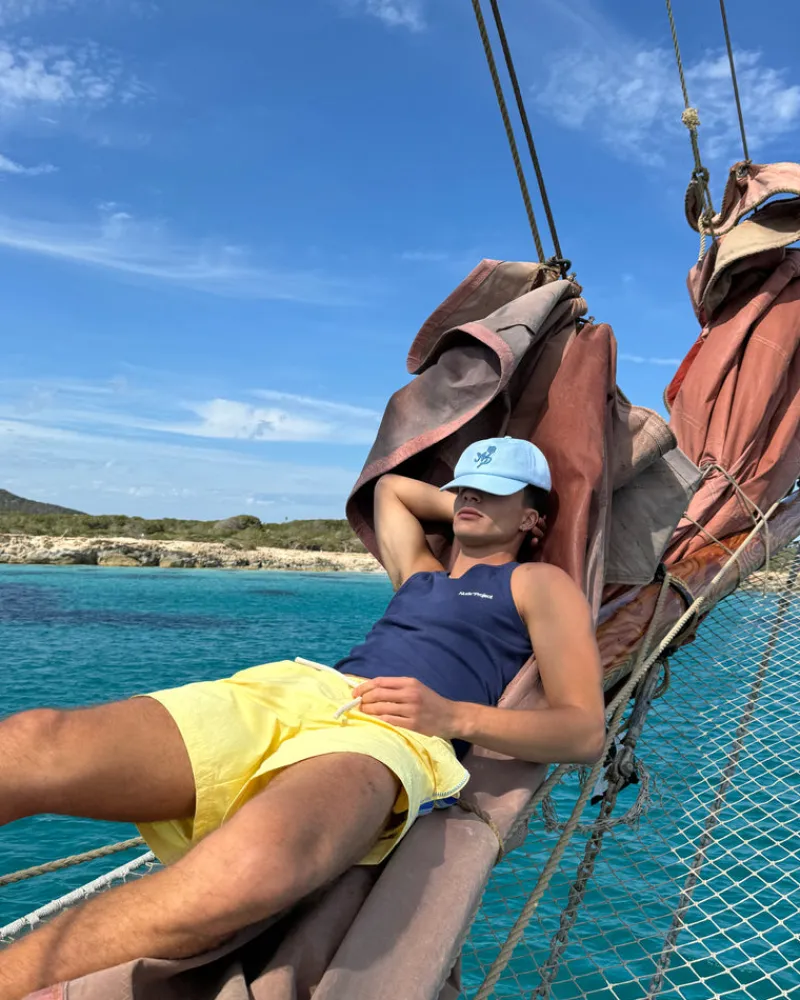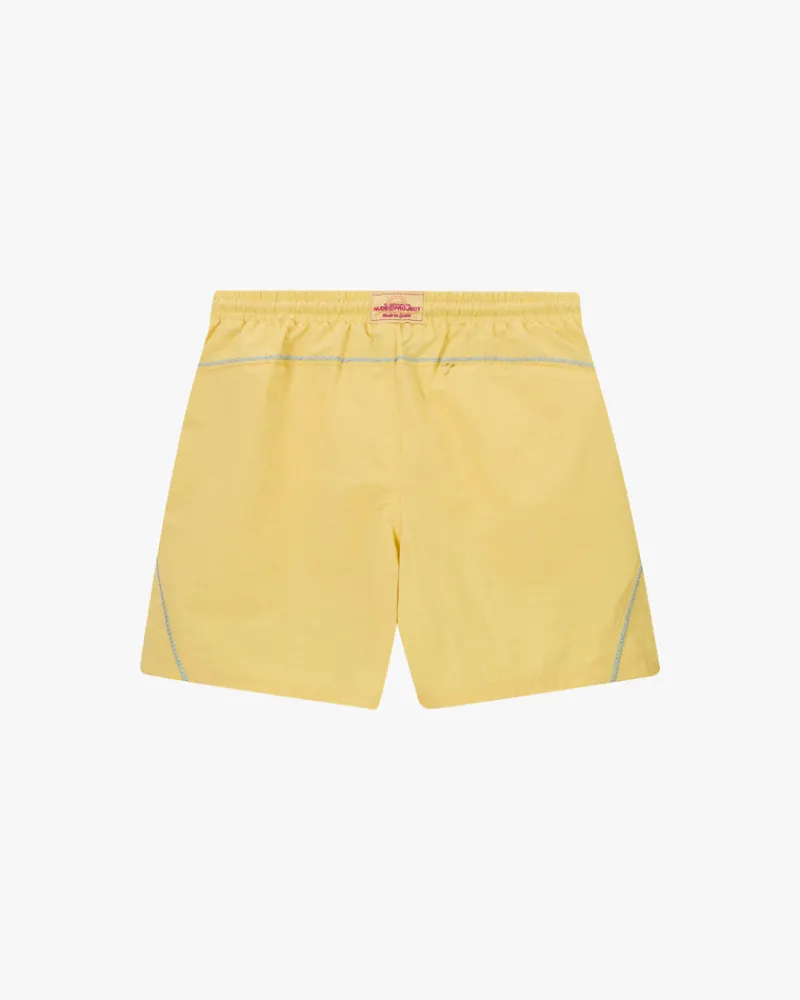 High density nylon swimsuit with two-tone band, decorative cross stitch and back pocket.